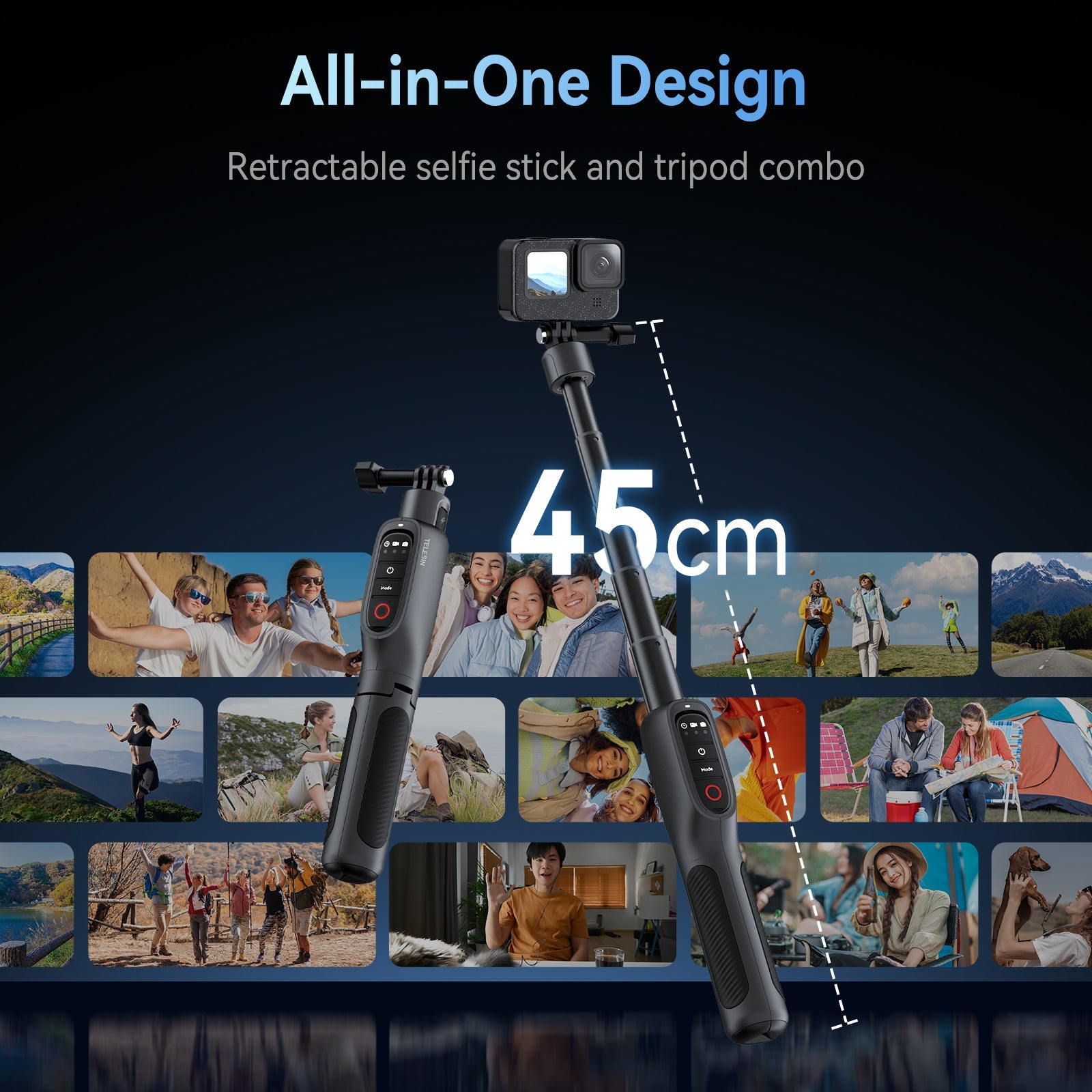 All-in-one design with telescopic selfie stick and tripod.