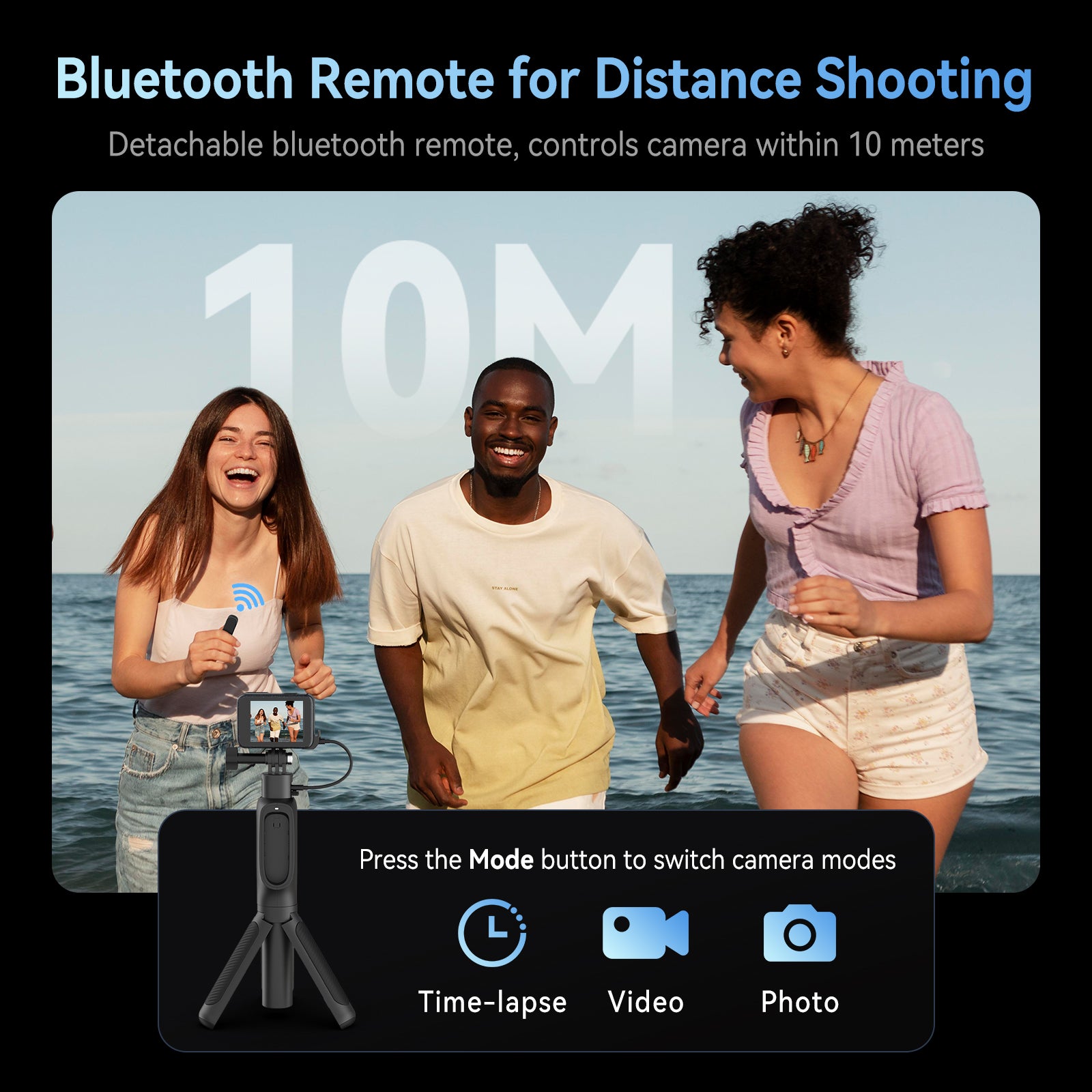 Bluetooth remote control can control the camera from 10 meters.