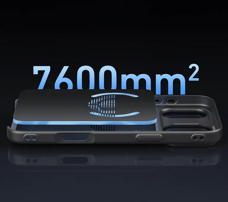 A massive 7,600mm² graphene thermal layer lines nearly the entire inner surface of the case, making full contact with the iPhone’s back to rapidly and efficiently draw heat away. Precision-cut vent grilles boost airflow, accelerating cooling and keeping your device comfortable to hold.