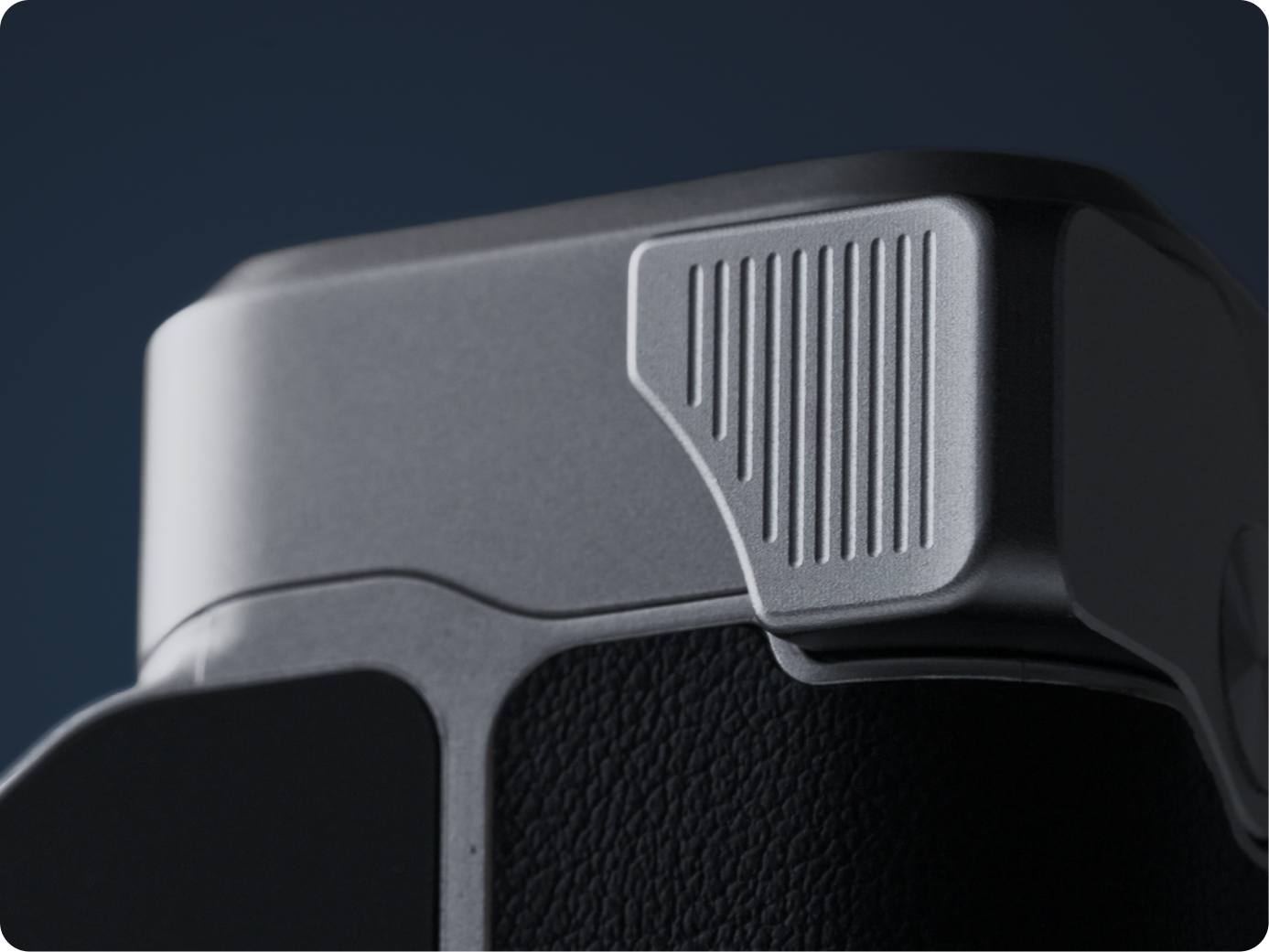Its curves and leather coverage have been refined through extensive field testing with over 100 experienced photographers, then refined through multiple iterations to achieve a natural fit for most hand shapes. The result delivers 90% of the comfort of a top-tier professional camera grip — surpassing most compact CCD cameras. Due to the large sweeping surfaces, each leather wrap is applied entirely by hand by craftsmen with over a decade of experience, ensuring a flawless, seamless finish.